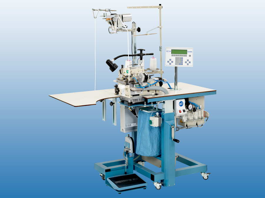 Schneiden und automatisches Wiedereinführen des Gummis unter den Drückerfuss.