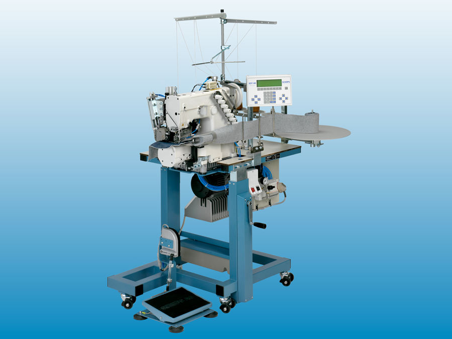 Modernste 2-Nadel Zylinderarm-Doppelkettenstichmaschine (Basis 4-Nadel) mit einem Standard-Nadelabstand von 38.2 mm. Programmierbare Länge für absichtliche Fehlstiche am Anfang und am Ende des Bundes, dadurch können Anfang und Ende des Bundes anschliessend eingeschlagen und vernäht werden, einfach umrüstbar für Fehlstiche nur für die linke oder für beide Nadeln. 2-Puller-System für ein genaues, rechtwinkliges Schneiden. HS 21-S-90 pneumatischer, geräuscharmer Bandabschneider in verstärkter Ausführung, speziell starkes Messer mit hoher Lebensdauer. Modernste und einfach zu bedienende Steuerung. HS 1001-NW Z-Gestell ohne Rollen.
