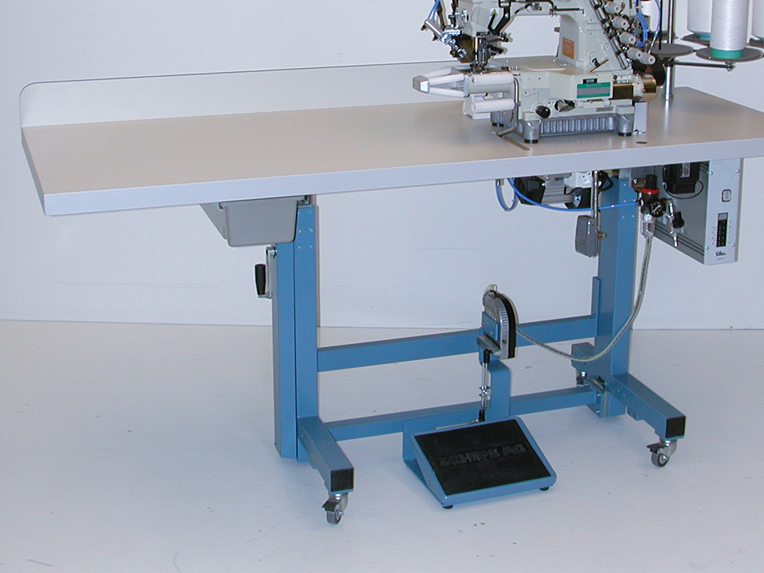 Hochproduktiver Näharbeitsplatz, um Elastikringe an Strümpfe anzunähen.