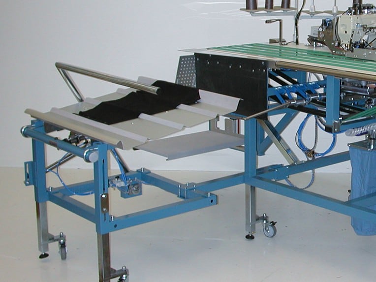 Falten der Teile für ein nachfolgendes Schliessen mit kürzesten Griffzeiten. Das Teil wird so gefaltet und abgestapelt, dass das Schliessen mit einer Overlock Nähmaschine sehr rationell erfolgen kann. Der Zeitpunkt der Faltung kann genau bestimmt werden.
