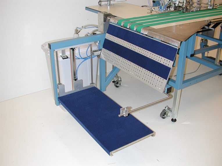 Modifikation des Kleinteilestaplers auf 750 mm Breite für lange schmale Artikel wie lange Ärmel, Hosenbeine etc.
