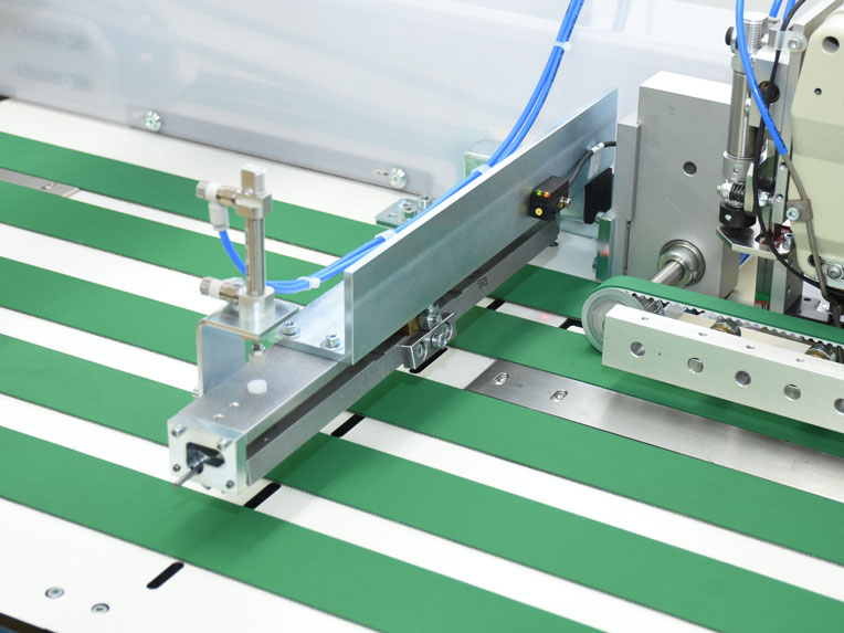 Ärmel, Brusttaschen, Vorder- und Rückenteile von T-Shirts, Poloshirts usw. offen/flach mit Blindstich-Overlock säumen. Höchste Qualität und gleichmässige Saumbreite von Anfang bis Ende der Naht durch optimal konzipierte Saumführung und Nähteile. Hohe Produktivität durch schnelles, permanentes Bestücken und ein praktisch ununterbrochenes Nähen mit Maximalgeschwindigkeit. Vollautomatisches Nähen durch im Tisch integrierte Transportbänder und Stapler, dadurch eine geringe Anlernzeit der Bedienperson. Höheneinstellbares Gestell für ein ergonomisches Arbeiten, hohe Servicefreundlichkeit durch ausfahrbare, frei zugängliche Nähmaschine. Der modulare Automat ist flexibel erweiter- und ausbaubar, unterstützt durch modernste, leistungsfähige Elektronik.