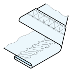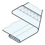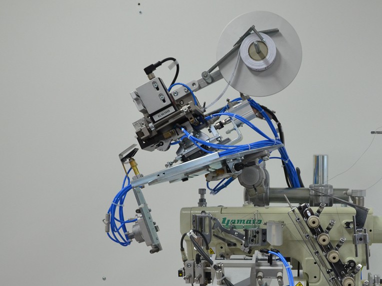 Vollautomatisches Einnähen eines Etiketts bei Nähstart in den Saum. Das Etikett kann flach oder als Schlaufe miteingenäht werden.