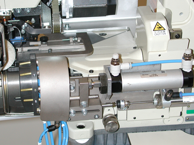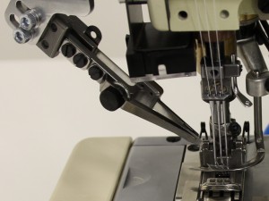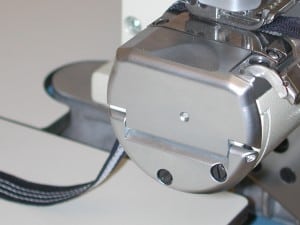 Saumführung (2 Breiten verstellbar) Die Saumführung wechselt programmgesteuert zwischen 2 unterschiedlichen mechanisch einstellbaren Gummi/Saumbreiten. Sie dient zur exakten Führung des Gummis sowie der Saumbildung. Der Anschlag rechts in der Führung ist gefedert und past sich an Verdickungen durch Quernähte und Soffeinlagen in der Naht an. Somit wird auch bei Dickstellen in der Naht das Nähgut nie gebremst oder blockiert nicht. Im Einlaufbereich der Saumführung befinden sich Bläser, welche das Material glatt streifen.