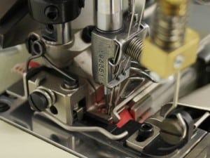 2-Nadel Saummaschine mit kleinem Zylinderarm zum Säumen von kleinen Durchmessern. Die Maschine ist mit Fadenabschneider und Puller ausgestattet.