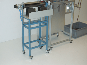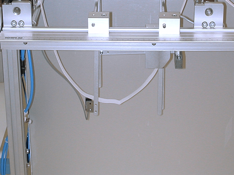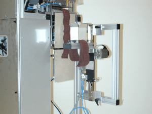 Nach Erkennen der Klebestelle rechnet die Software aus ob noch ein komplettes Teil gefertigt werden kann oder nicht. Danach wird bis nach der Klebestelle transportiert und abgeschnitten. Der Abfall wird ausgeschieden.