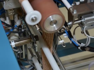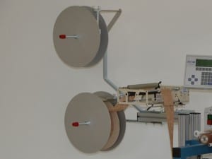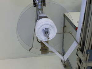 Automatisches Abziehen und Aufwickeln des Papierabdeckbandes bei sehr klebrigen silikonbeschichteten Strumpfbänder.