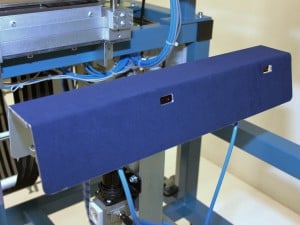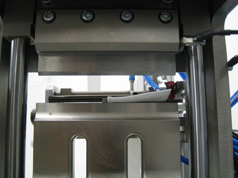 Schneiden und gleichzeitig verschweissen der Schnittkante mit 20 KHz Ultraschalltechnologie. Bausatz bestehend aus: Ultraschallgenerator, Konverter, Booster, Sonotrode, Spezialsoftware und mechanischen Aufbau.