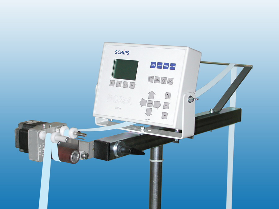 Small, extremely compact and versatile sensor metering device with electronic tension monitoring for tape width up to 50 mm. Manual tension change by actuating a knee switch or automatically via external stitch impulse (optional). 100 garments with 9 seams per garment and 9 length-sections per seam. Unlimited tape tension values can be programmed for each length-section. Automatic determination of the control sensitivity per tape. Optimal adjustment of the rolls if there are different thicknesses in the cross section of the tape. Very high control dynamics in smooth motion control.
