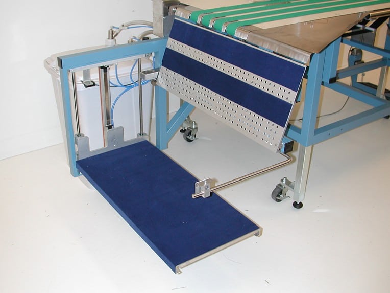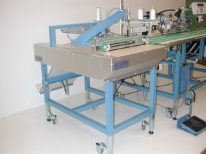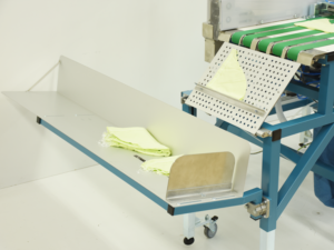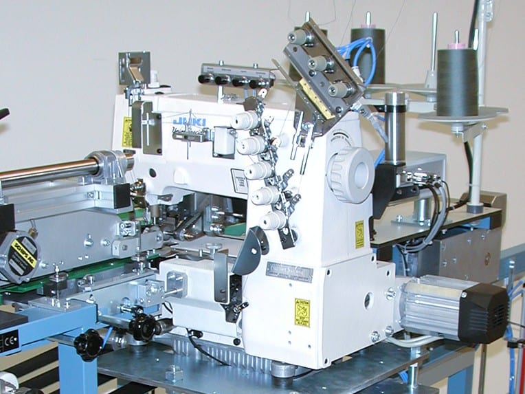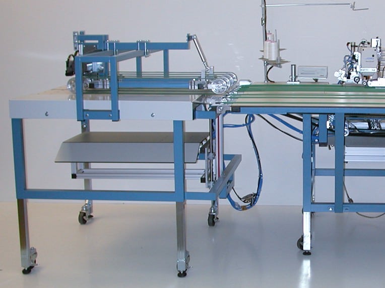 Hemming of sleeves, breast pockets, front and back parts of T-shirts, poloshirts etc., open/flat operation with 2 needle cover stitch machine. High quality and consistent hem width from the beginning to the end of seam due to the optimum conception of hemming guide, special sewing parts, top conveyor belt, right hand independently driven side knife and thread chain cutting system. High productivity is achieved through the quick and permanent loading of the automat and practically uninterrupted sewing with maximum sewing speed. Fully automatic sewing cycle because of the conveyor belts integrated in the table and stacker, resulting in reduced training time of the operator. Frame with height adjustment for ergonomic working, ease service due to the movable and therefore free accessible sewing machine. Flexible upgrades of the modular automat possible, supported by the high-tech and efficient electronics.