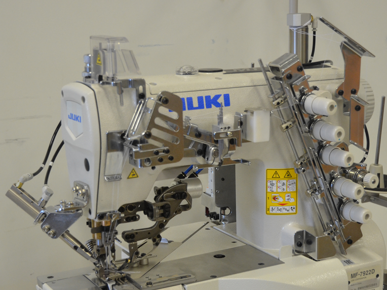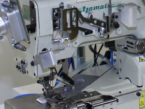 3 needle cylinder-arm hemming machine, alternatively available with needle distance 4.8 / 5.6 or 6.4 mm, thread cutter, cover thread cutter, left side knife, fabric waste suction, 6’000 rpm