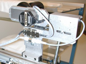 Label dispenser with stepper motor for cutting to length of tape, mark reader, folding unit, device mounting, roll holder, knife cutting system, pneumatic, holding clamp for labels, CB40-C control unit with stepper motor module, compact version, SMD40 stepper motor drive
