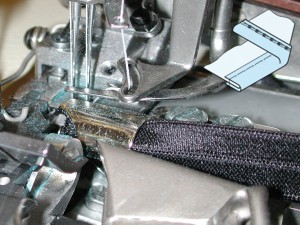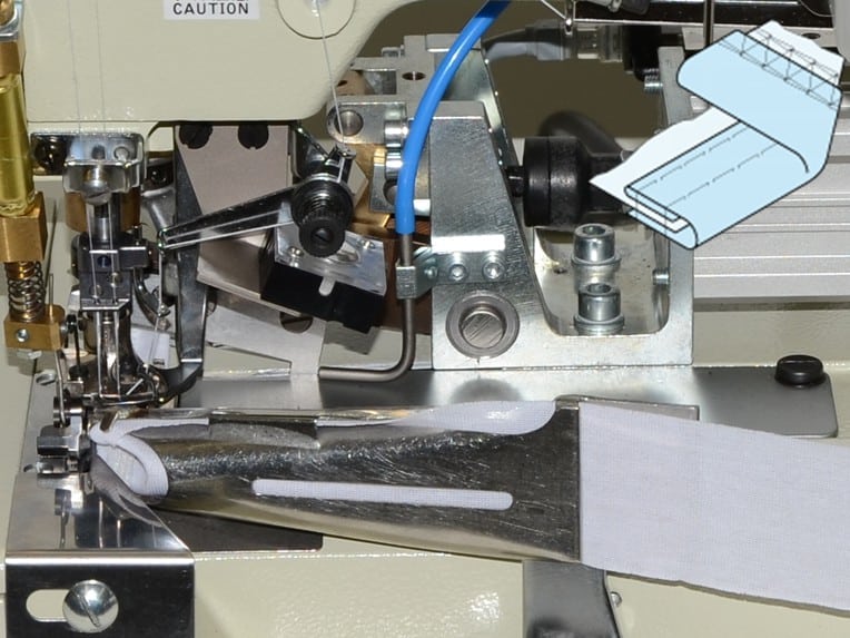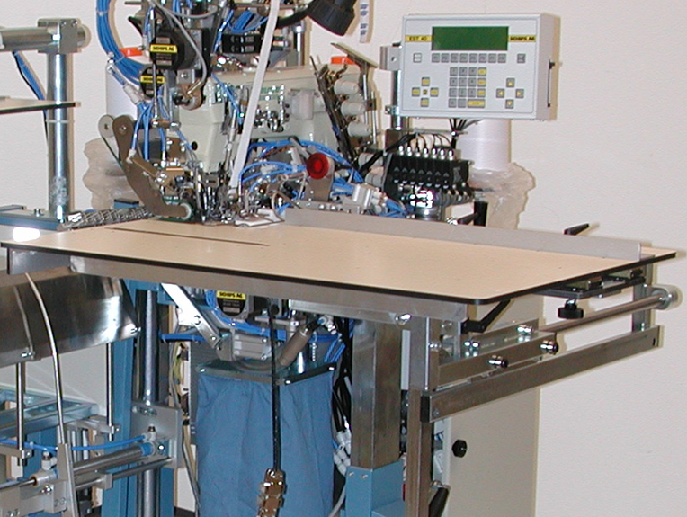 Automatic attaching of tape from a roll or out of a box, with 2/3 needle interlock sewing machine, to open (front and back pieces separately) or half closed waist (one side seam open, the other closed).